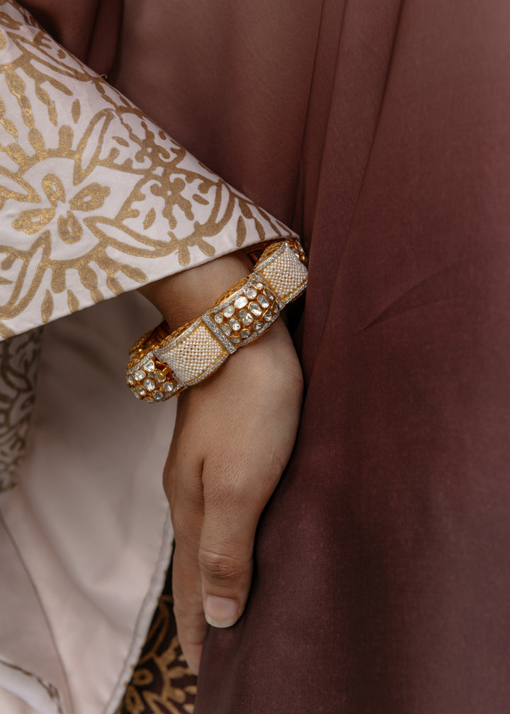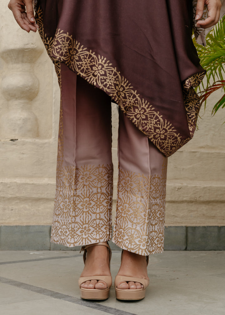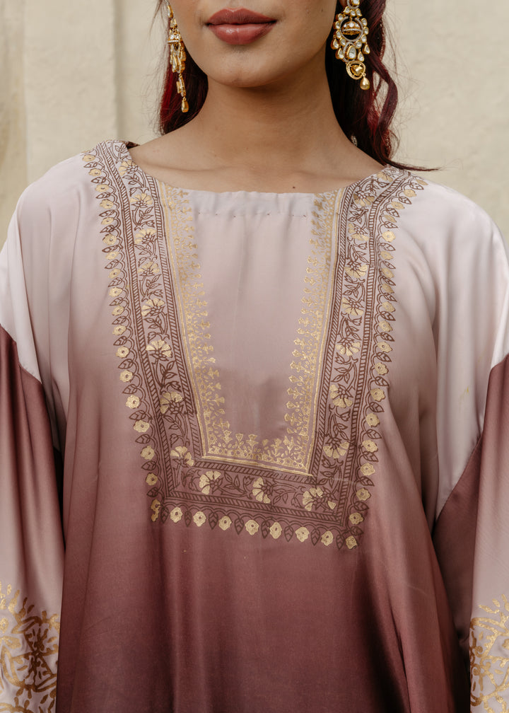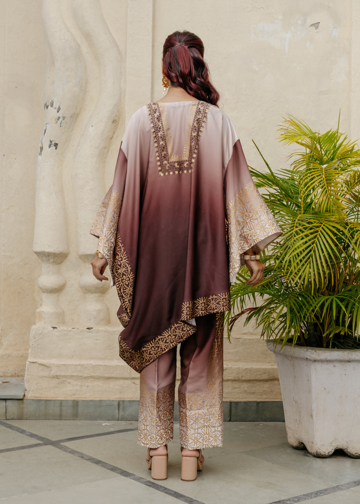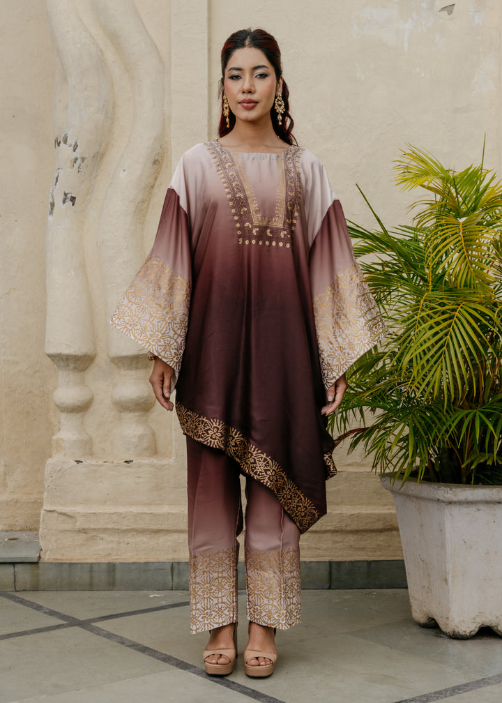 The Zameen Raag kaaftan strikes a perfect balance between relaxed silhouette and artistic detail. Crafted in rich satin, this high-low kaaftan flows effortlessly in earthy shades of deep brown and soft off-white. Featuring hand block prints on the neckline, borders, and sleeves, it’s elevated with delicate embroidery that reflects heritage craftsmanship.